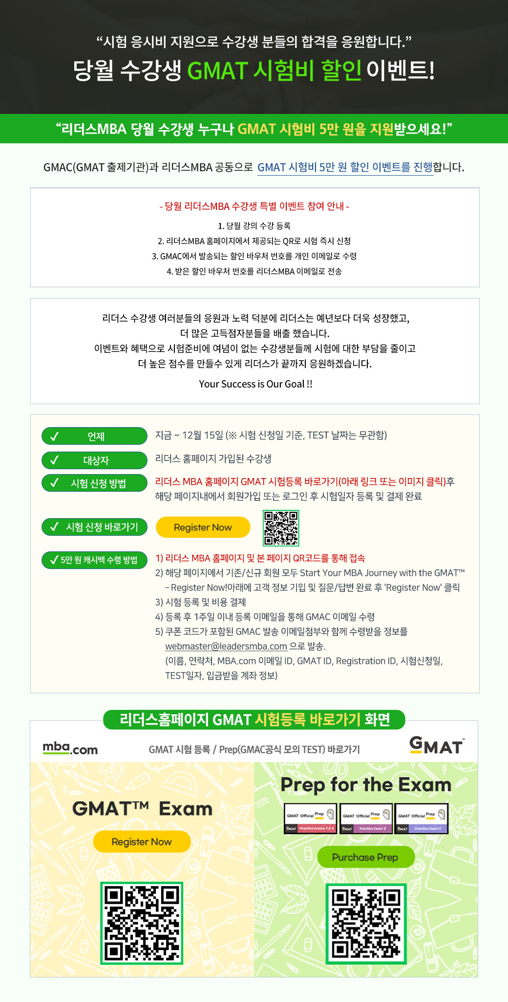 당월 수강생 GMAT시험비 할인 이벤트 페이지 정보 작성자 리더스 댓글 0건 조회 276회 작성일 25-11-14 13:10 목록 본문 이전글12월 RC이론&적중(주말반) 수업 일정 안내 25.11.17 다음글HKU(홍콩대) MBA Info Session in 리더스MBA: 11월 15일(토) 1:00pm 25.10.29 댓글 0 댓글목록 등록된 댓글이 없습니다.
