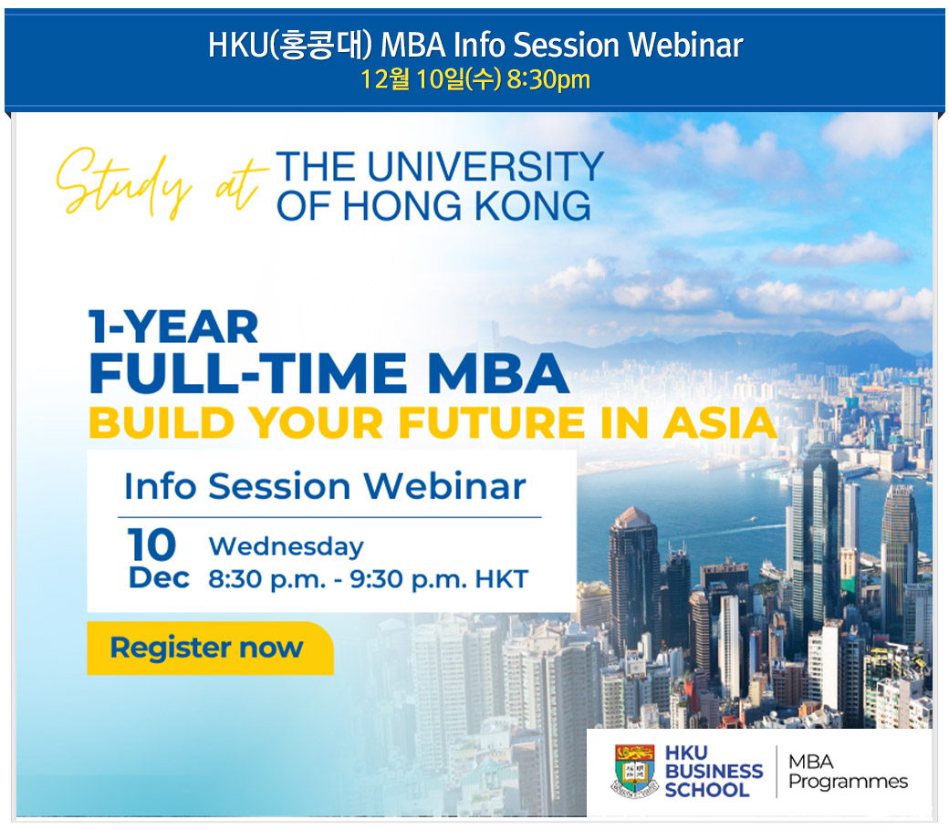 HKU(홍콩대) MBA Info Session Webinar: 12월 10일(수) 8:30pm 페이지 정보 작성자 리더스 댓글 0건 조회 29회 작성일 25-11-28 12:38 목록 본문 다음글GMAT 고득점 전략 설명회: 12월 20일(토) 오후2시 25.11.24 댓글 0 댓글목록 등록된 댓글이 없습니다.