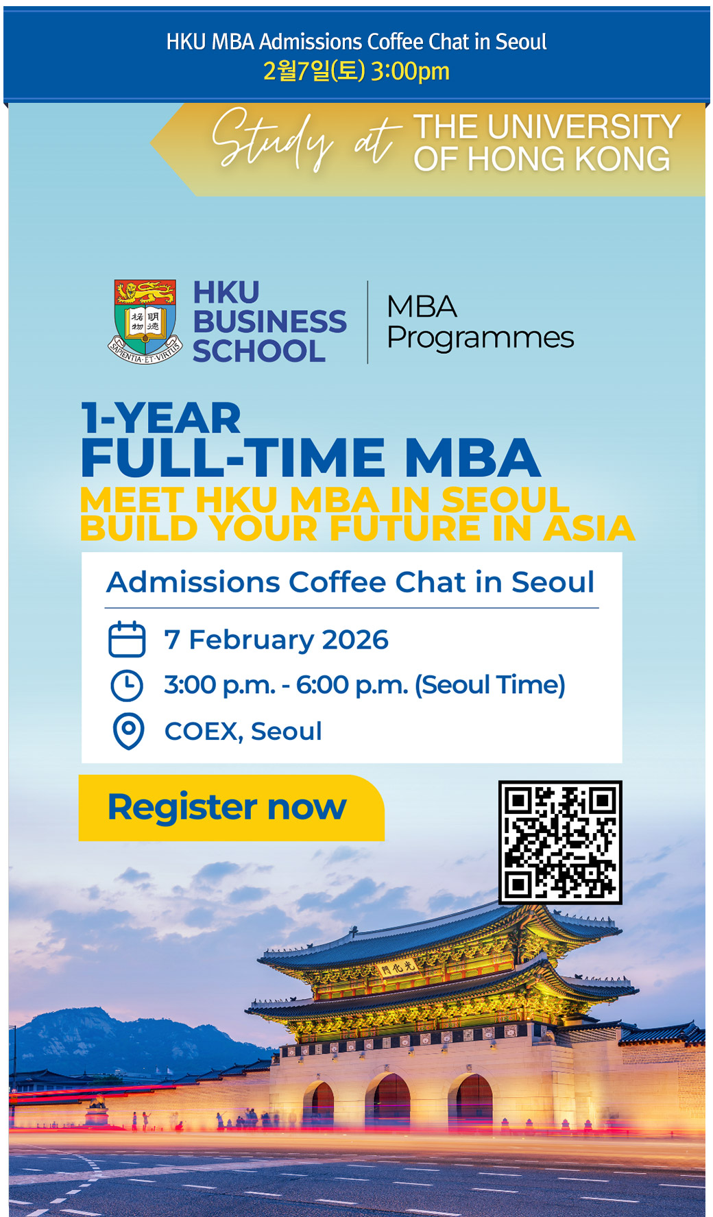 HKU MBA Admissions Coffee Chat in Seoul: 2월7일(토) 3:00pm 페이지 정보 작성자 리더스 댓글 0건 조회 21회 작성일 26-01-28 14:21 목록 본문 다음글GMAT 고득점 전략 설명회: 2월 21일(토) 오후 2시 26.01.21 댓글 0 댓글목록 등록된 댓글이 없습니다.