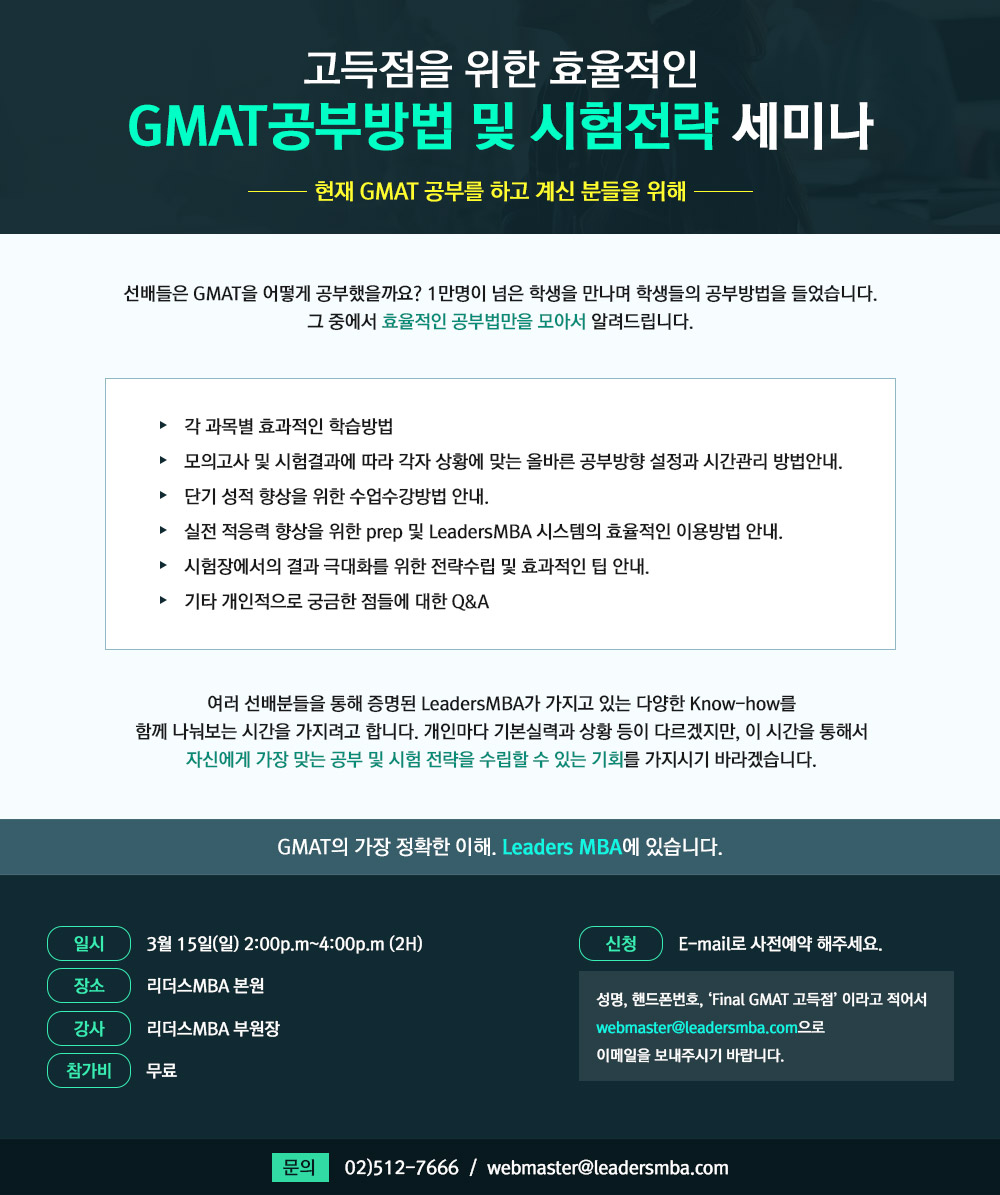 수강생을 위한 ㅡ 효율적인 GMAT공부방법 및 시험전략 세미나: 3월 15일(일) 오후2시 페이지 정보 작성자 리더스 댓글 0건 조회 15회 작성일 26-03-03 13:31 목록 본문 이전글GMAT 고득점 전략 설명회: 3월 28일(토) 오후2시 26.03.03 다음글CR 중급반 OPEN: 3월 5일(목) 저녁7시 26.02.23 댓글 0 댓글목록 등록된 댓글이 없습니다.
