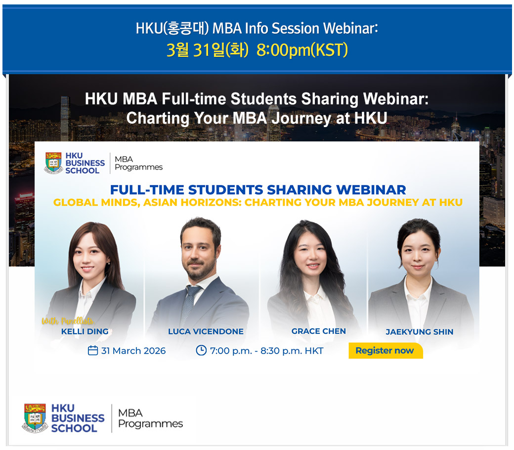 HKU(홍콩대) MBA Info Session Webinar: 3월 31일(화) 8:00pm(KST) 페이지 정보 작성자 리더스 댓글 0건 조회 77회 작성일 26-03-25 13:05 목록 본문 이전글QS World MBA Tour 국내 최대 규모 해외 MBA박람회: 4월 14일(화) 6:00pm 26.03.31 다음글TOP MBA 지원 및 합격 전략 세미나: 4월 19일(일) 오후3시 26.03.25 댓글 0 댓글목록 등록된 댓글이 없습니다.