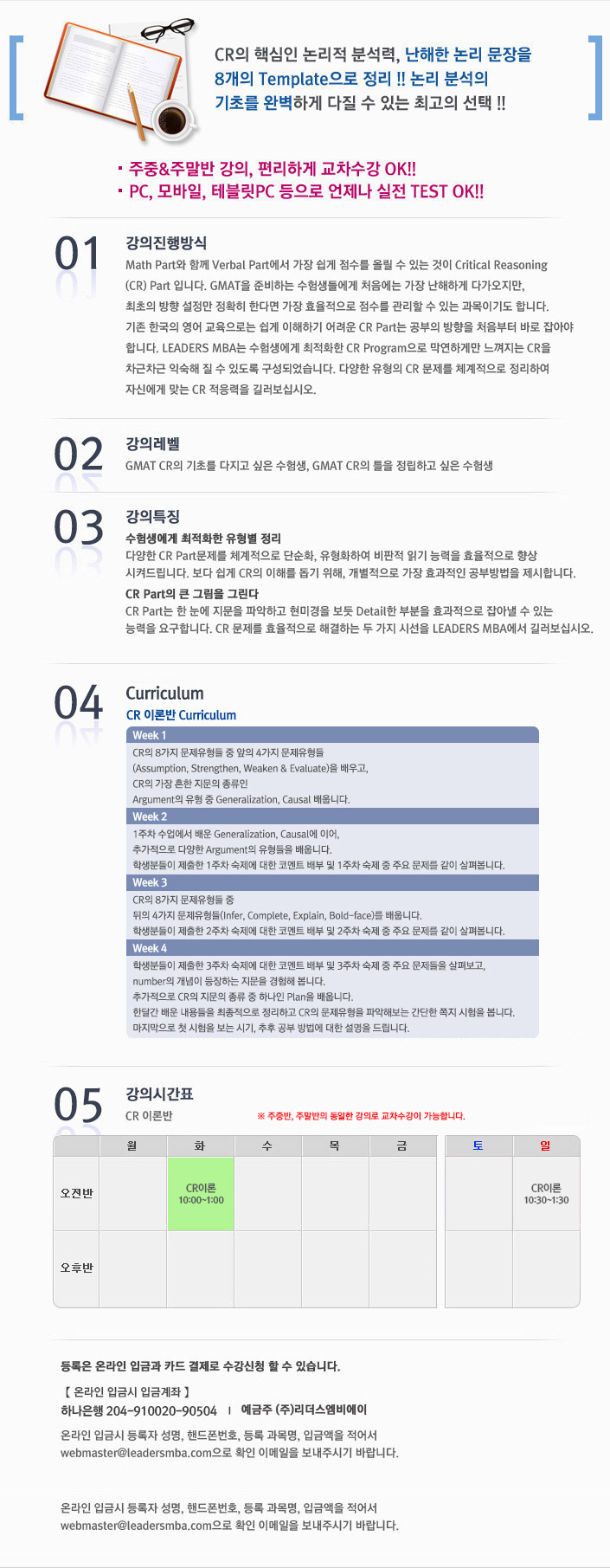 강의시간표 리더스MBA의 각 강의별 시간표 및 수강신청이 가능합니다.