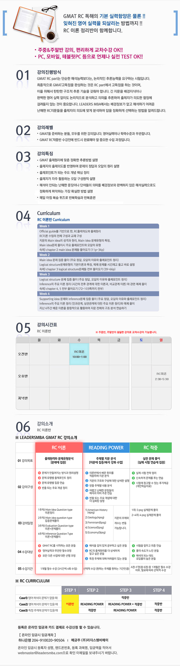 강의시간표 리더스MBA의 각 강의별 시간표 및 수강신청이 가능합니다.